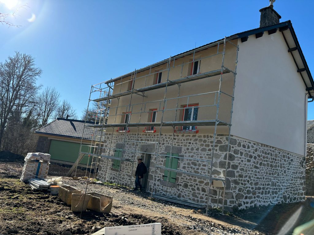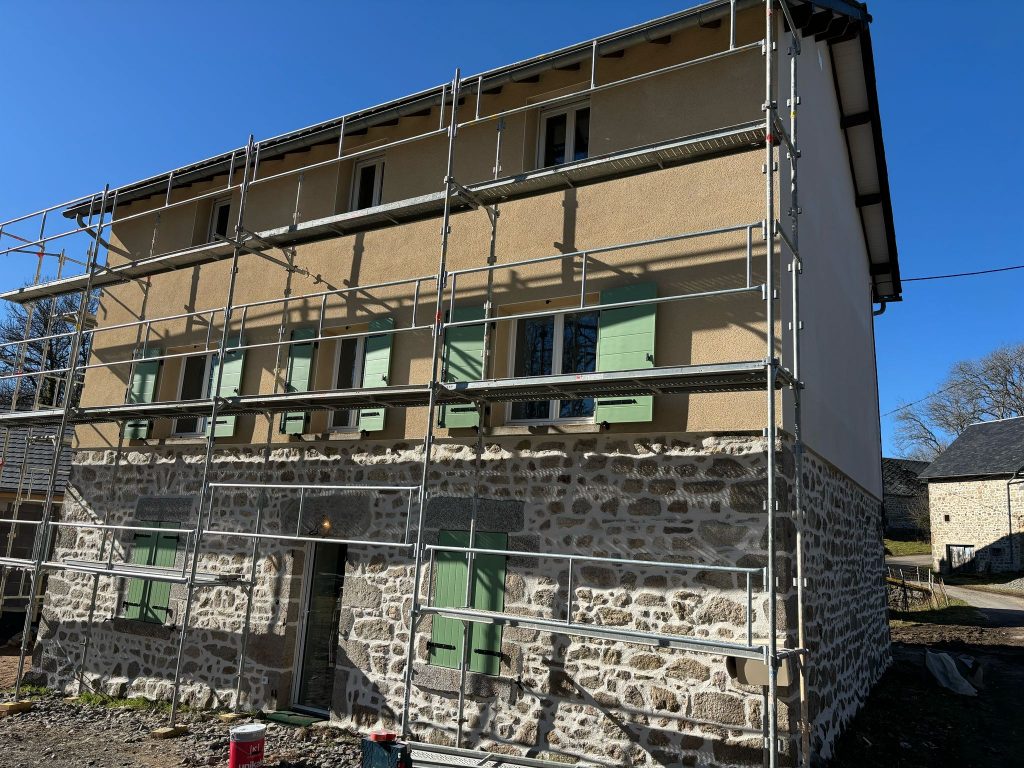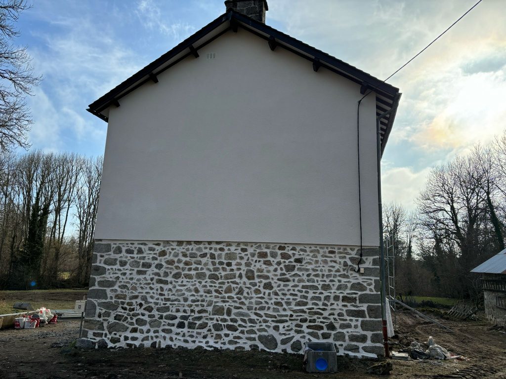 ASM Façade 63 est intervenu à Aydat pour réaliser une rénovation de façade complète sur une maison en pierre. Ce projet a combiné une application d’enduit finition grattée sur l’étage et un traitement esthétique et protecteur de la maçonnerie en pierre sur le bas de la façade.